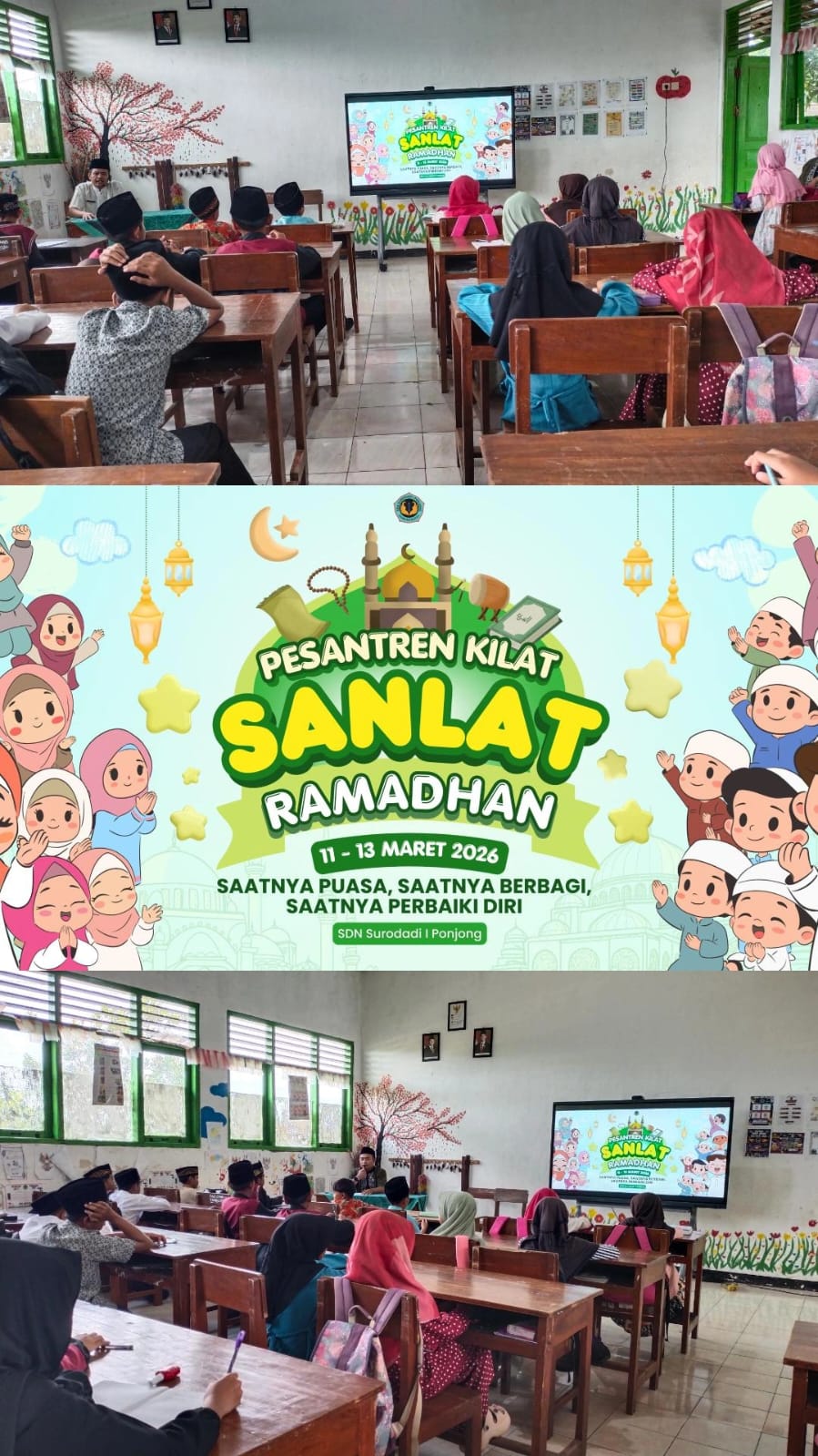 Ponjong - Pesantren kilat Ramadhan SDN Surodadi I Ponjong dilaksanakan mulai tanggal 11 Maret hingga 12 Maret 2026 yang Pesantren kilat Ramadhan berjalan dengan lancar yang dibuka resmi oleh Bapak Subiasto, S.Pd selaku kepala sekolah pada Rabu, 11 setelah shalat dhuha berjama’ah. Bapak kepala sekolah menyampaikan dalam sambutannya semoga dengan kegiatan selama bulan Ramadhan ini dapat menambah pengetahuan terutama berkaitan dengan agama Islam, serta dapat membentuk karakter peserta didik terutama dalam hal adab sebagai siswa yang berakhlak